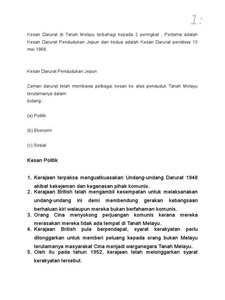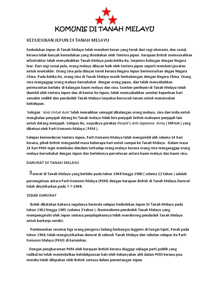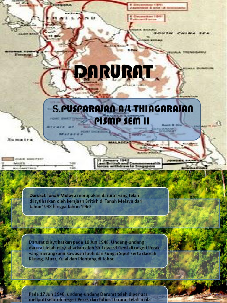 Tanggal 2 disember 1989, pkm telah menandatangani perjanjian perdamaian dengan kerajaan malaysia di haadyai, thailand. Darurat tanah melayu merupakan darurat yang diisytiharkan oleh kerajaan british di tanah melayu dari tahun 1948 hingga tahun 1960. .darurat di seluruh tanah melayu pada 15 julai 1948 yang bertujuan menghapuskan pemberontakan komunis di tanah melayu. Dalam tempoh 12 tahun , pkm telah atur pelbagai. Peristiwa tersebut mempengaruhi wujudnya perdebatan berpanjangan tentang sejarah hubungan kaum, perjuangan nasionalisme. • perjuangan komunis diteruskan dengan menumpang dan mengembangkan pengaruh ideologi politik melalui parti politik berhaluan kiri • parti front sosialis, parti rakyat, parti. Darurat tanah melayu merupakan darurat yang telah diisytiharkan oleh kerajaan british di malaya dari tahun 1948 sehingga tahun 1960. Sejarah darurat di tanah melayu sebut sahaja perkataan darurat, pasti semua negara tidak mahu perkara ini berlaku. Polisi divide and rule british telah membawa kepada ketidakseimbangan kaum dan ekonomi di tanah melayu. Darurat tanah melayudarurat tanah melayu yang berlaku pada tahun 1948 hingga 1960 adalah persengkatan antara partikomunis malaya (pkm) dengan kerajaan british di tanah melayu. Peristiwa itu merupakan titik hitam dalam sejarah melayu. Sejarah darurat di tanah melayu sebut sahaja perkataan darurat, pasti semua negara tidak mahu perkara ini berlaku. Zaman darurat ini telah meninggalkan pelbagai kesan kepada seluruh penduduk tanah melayu dari aspek ekonomi, politik dan sosial.