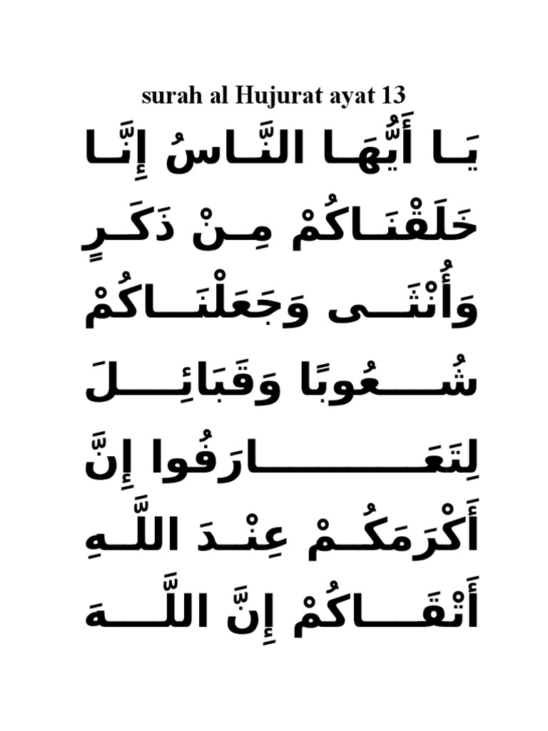 Pada tulisan ini hanya akan dimuat arti perkata pada 3 ayat tersebut saja, jika sobat menginginkan bacaan surat tersebut secara lengkap baik teks. يَا أَيُّهَا النَّاسُ إِنَّا خَلَقْنَاكُمْ مِنْ ذَكَرٍ وَأُنْثَىٰ وَجَعَلْنَاكُمْ شُعُوبًا وَقَبَائِلَ لِتَعَارَفُوا ۚ إِنَّ أَكْرَمَكُمْ عِنْدَ اللَّهِ أَتْقَاكُمْ ۚ إِنَّ اللَّهَ عَلِيمٌ خَبِيرٌ. Tajwid surat al hujurat ayat 13 masrozak dot com. Read or listen al quran e pak online with tarjuma (translation) and tafseer. Surah ini tergolong surah madaniyah, terdiri atas 18 ayat.